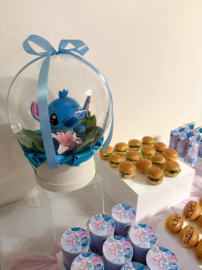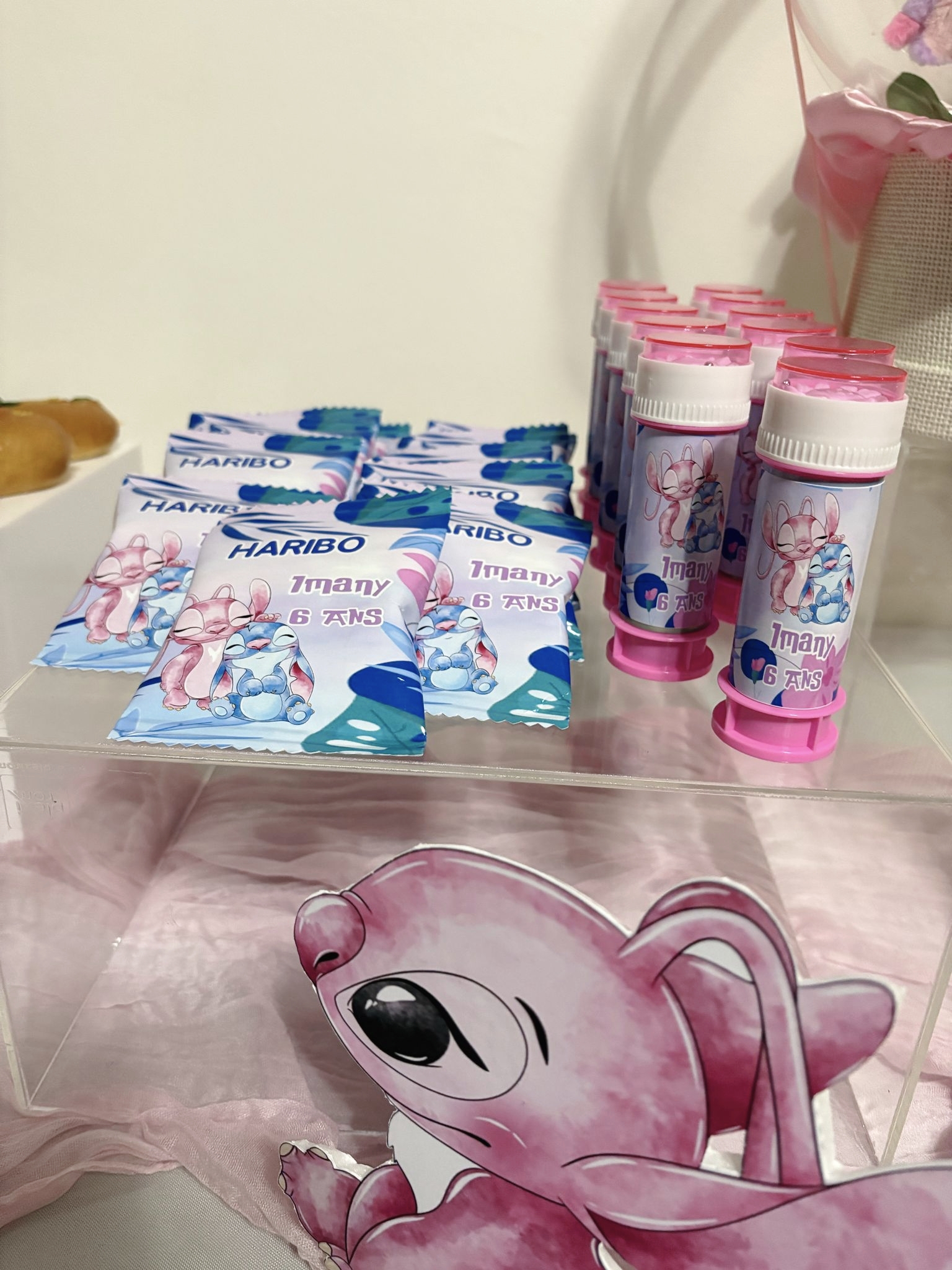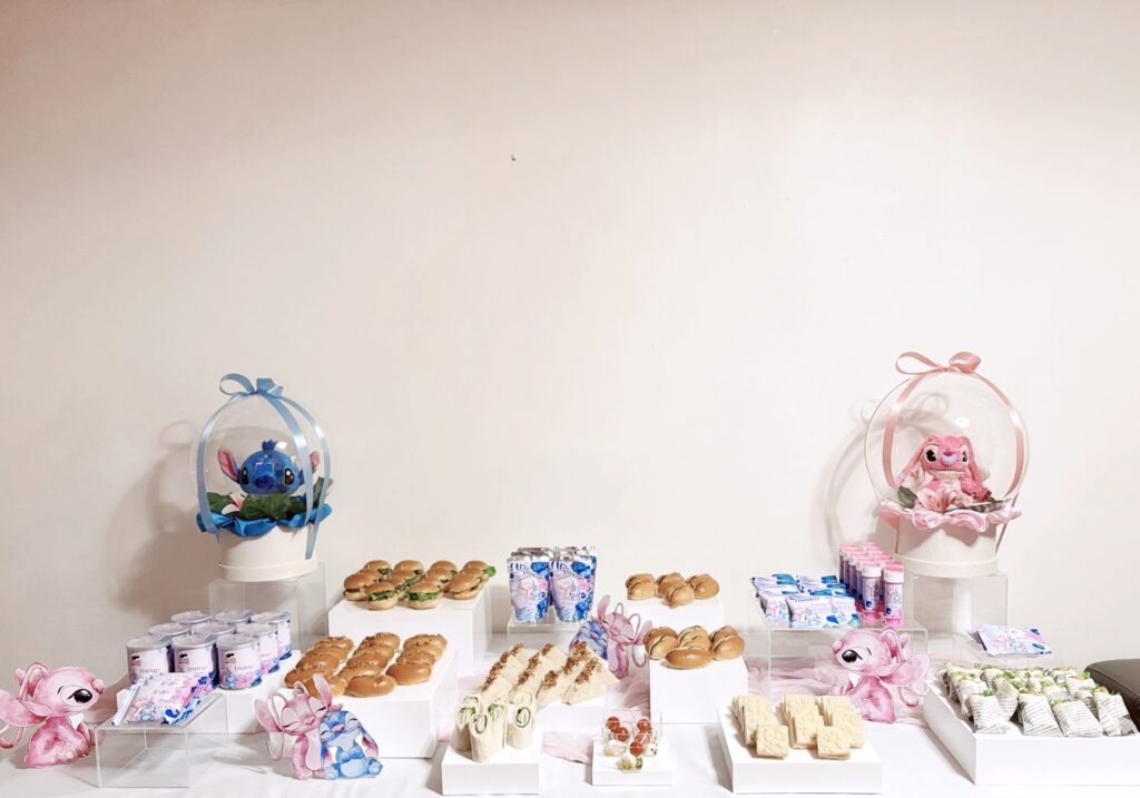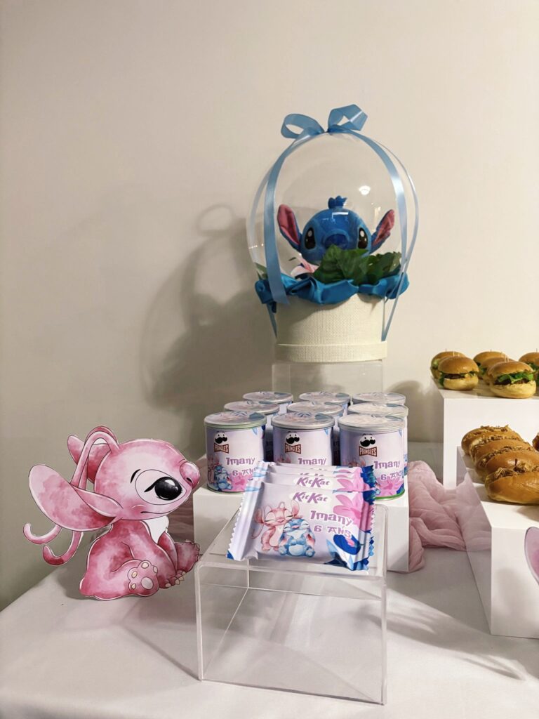 Le buffet met en scène les adorables personnages Stitch et Angel, déclinés en rose et bleu pastel, pour un rendu plein de tendresse.
