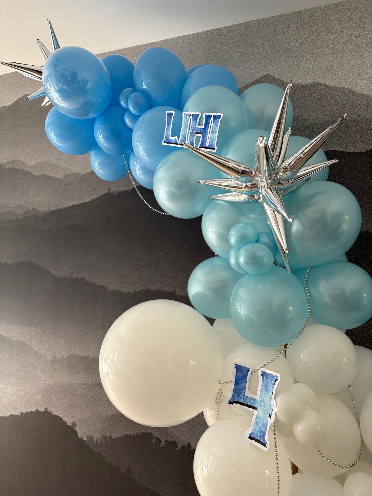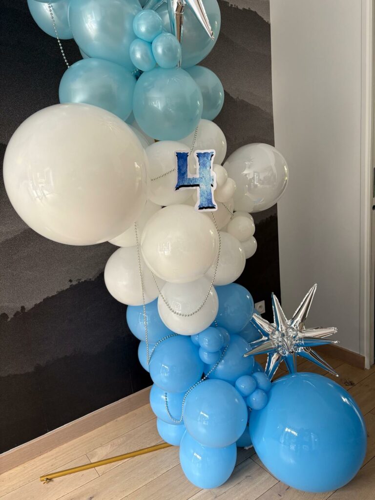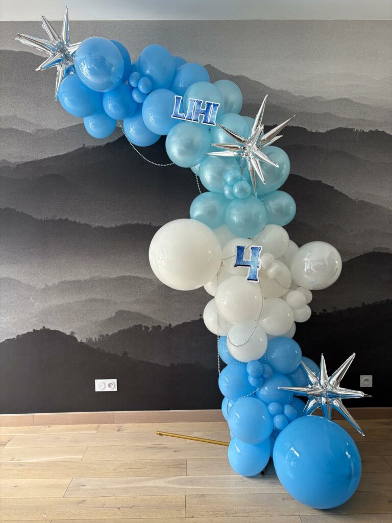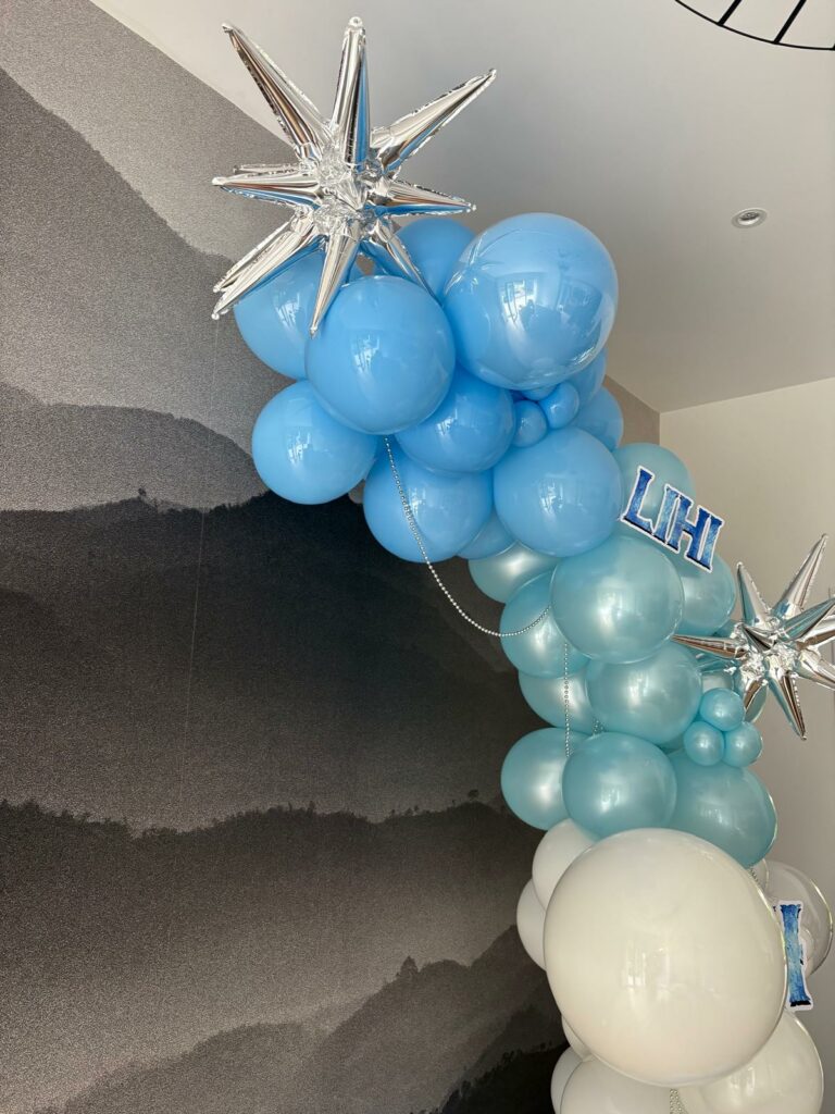 Pour célébrer les 4 ans de Lihi, Ina’Event a imaginé une arche de ballons dans des tons bleu ciel et blanc, sublimée par des étoiles argentées pour une touche magique et scintillante.