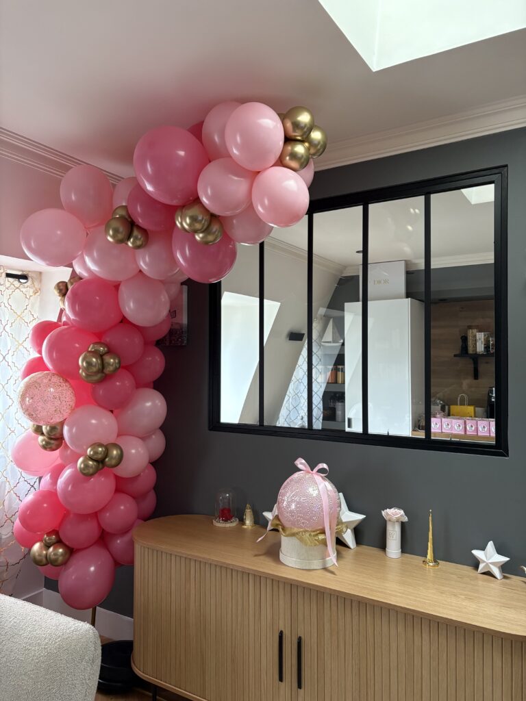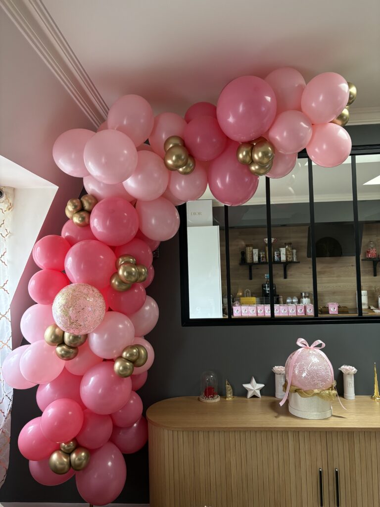 Une arche de ballons aux tons rose et doré, parfaite pour créer une ambiance douce et festive.